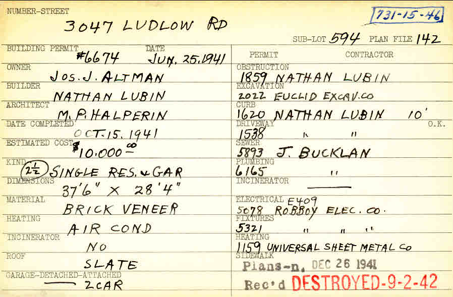 3047 Ludlow Road Shaker Heights, OH 44120 PARCEL ID: 731-15-046 Building Permit Date: 06-25-1941 Neighborhood: Ludlow Owner: Altman, Joseph J. Builder: Lubin, Nathan Architect: Halperin, M. P. Estimated Cost: 10000 Date Completed: 10-15-1941 Kind: Single 2-1/2 Material: Brick Veneer Heating: Air Conditioned Roof: Slate Garage: detached 2 car Blueprints: no blueprints on microfilm |