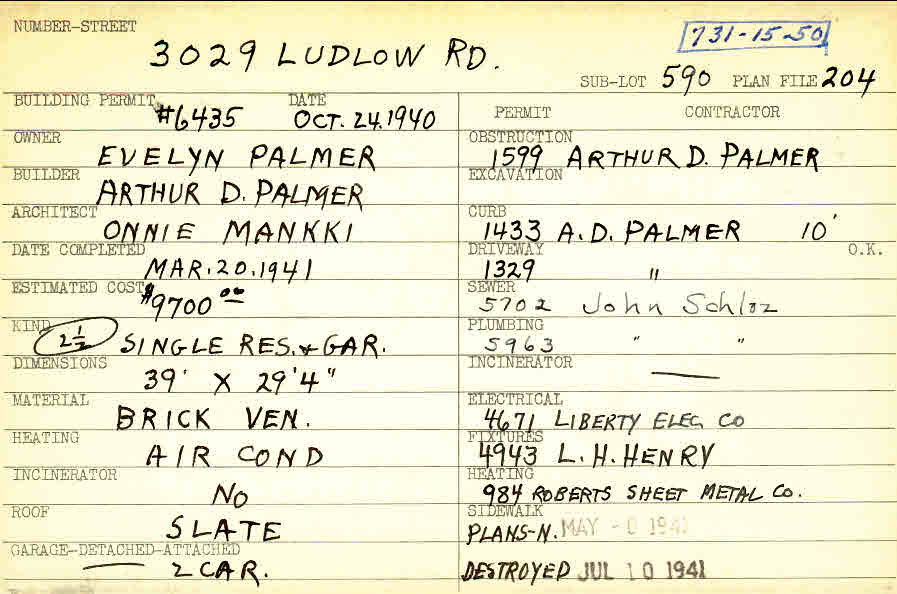 3029 Ludlow Road Shaker Heights, OH 44120 PARCEL ID: 731-15-050 Building Permit Date: 10-24-1940 Plan File Number: 204, 7930 Microfilm Roll: Roll#95 Neighborhood: Ludlow Owner: Palmer, Evelyn Builder: Palmer, Arthur D. Architect: Mankki, Onnie Estimated Cost: 9700 Date Completed: 03-20-1941 Kind: Single 2-1/2 Material: Brick Veneer Heating: Air Conditioned Roof: Slate Garage: detached 2 car |