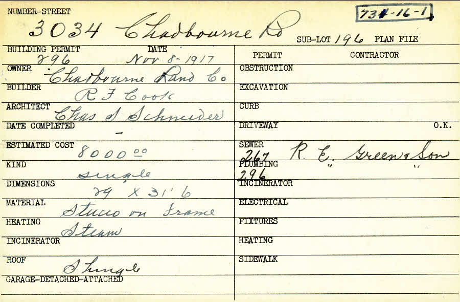 3034 Chadbourne Road Shaker Heights, OH 44120 PARCEL ID: 731-16-001 Building Permit Date: 11-08-1917 Plan File Number: 0 Neighborhood: Onaway Owner: Chadbourne Land Company Builder: Cook, R. F. Architect: Schneider, Charles S. Estimated Cost: 8000 Kind: Single, Single Residence or Dwelling Material: Stucco on Frame Heating: Steam Roof: Shingles |