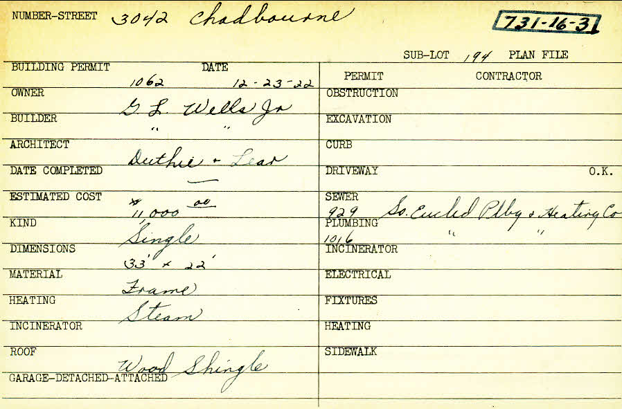 3042 Chadbourne Road Shaker Heights, OH 44120 PARCEL ID: 731-16-003 Building Permit Date: 12-23-1922 Plan File Number: 0 Neighborhood: Onaway Owner: Wells, G. L. Jr. Builder: Wells, G. L. Jr. Architect: Duthie and Lear Estimated Cost: 11000 Kind: Single, Single Residence or Dwelling Material: Frame Heating: Steam Roof: Wood Shingle |