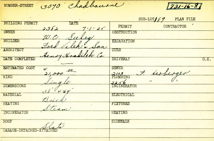 3070 Chadbourne Road Shaker Heights, OH 44120 PARCEL ID: 731-16-008 Building Permit Date: 07-01-1925 Plan File Number: 0 Neighborhood: Onaway Owner: Sieley, W. E. Builder: Fred Valek and Son Architect: Henry Hradileh Company Estimated Cost: 21000 Kind: Single, Single Residence or Dwelling Material: Brick Heating: Steam Roof: Slate Card Available: yes |