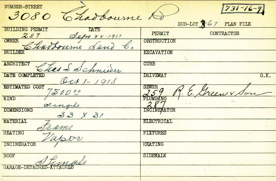 3080 Chadbourne Road Shaker Heights, OH 44120 PARCEL ID: 731-16-009 Building Permit Date: 09-22-1917 Plan File Number: 0 Neighborhood: Onaway Owner: Chadbourne Land Company Architect: Schneider, Charles Estimated Cost: 7500 Date Completed: 10-01-1918 Kind: Single, Single Residence or Dwelling Material: Frame Heating: Vapor Roof: Shingles |