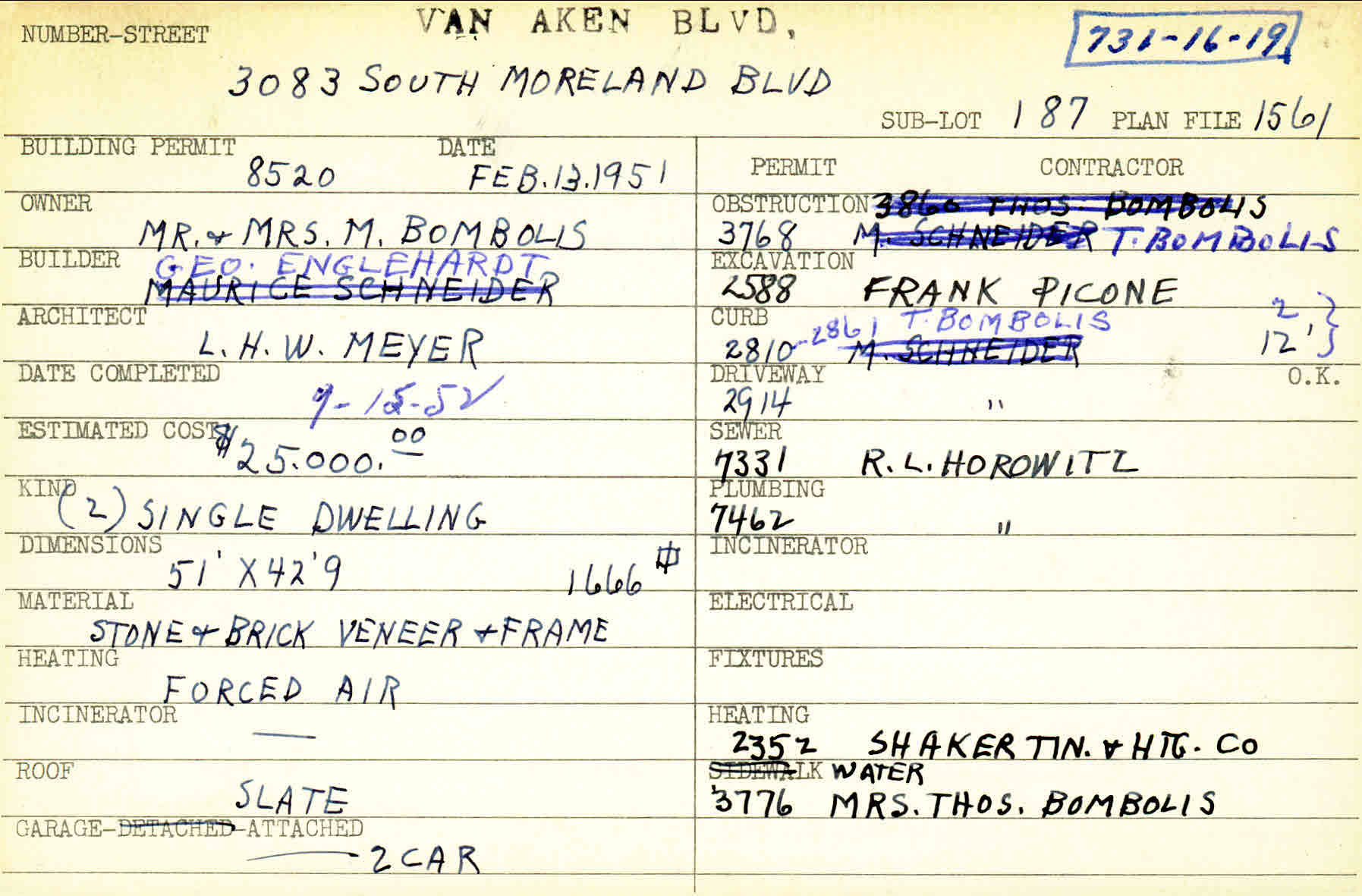 3085 Van Aken Boulevard Shaker Heights, OH 44120 PARCEL ID: 731-16-019 listed as 3083 South Moreland (Van Aken) on building card Building Permit Date: 02-13-1951 Plan File Number: 1561 all scanned Microfilm Roll: Roll024 Neighborhood: Ludlow Owner: Bombolis, M. Builder: Englehardt, George Architect: Meyer, L.H.W. Estimated Cost: 25000 Date Completed: 09-15-1952 Kind: Single, Single Residence or Dwelling (2) Material: Stone, Brick Veneer and Frame Heating: Forced Air Roof: Slate Garage: attached 2 car Card Available: Yes |