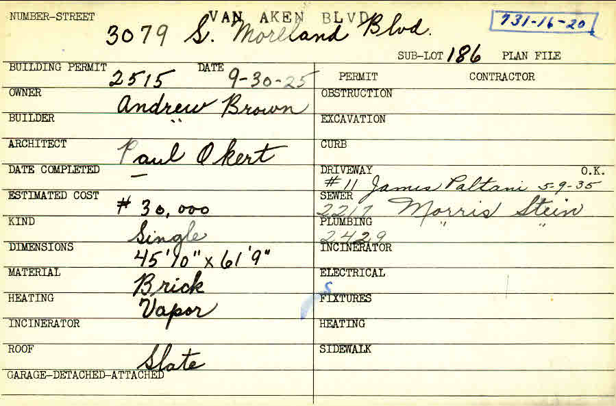 3079 Van Aken Boulevard Shaker Heights, OH 44120 PARCEL ID: 731-16-020 Building Permit Date: 09-30-1925 Neighborhood: Onaway Owner: Brown, Andrew Builder: Brown, Andrew Architect: Okert, Paul Estimated Cost: 30000 Kind: Single, Single Residence or Dwelling Material: Brick Heating: Vapor Roof: Slate Blueprints: no blueprints on microfilm |