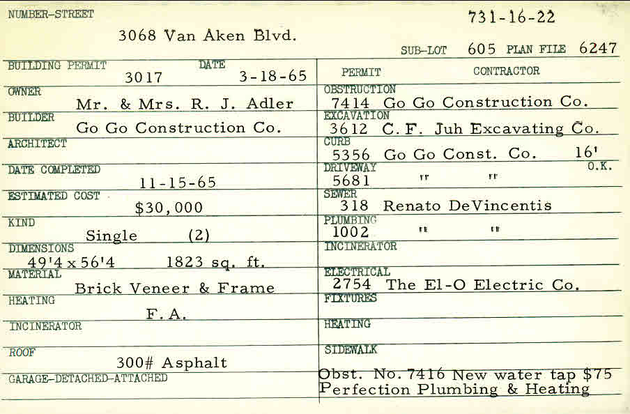 3068 Van Aken Boulevard Shaker Heights, OH 44120 PARCEL ID: 731-16-022 Building Permit Date: 03-18-1965 Plan File Number: 6247 Microfilm Roll: Roll#84 Neighborhood: Ludlow Owner: Adler, Mr. and Mrs. R. J. Builder: Go Go Construction Company Estimated Cost: 30000 Date Completed: 11-15-1965 Kind: Single, Single Residence or Dwelling (2) Material: Brick Veneer and Frame Heating: Forced Air Roof: 300# Min Asphalt |