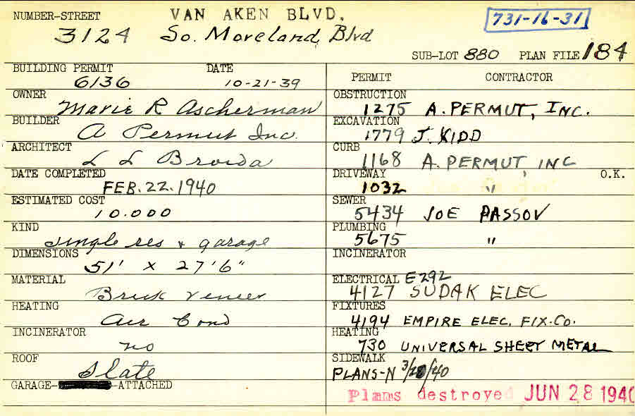 3124 Van Aken Boulevard Shaker Heights, OH 44120 PARCEL ID: 731-16-031 Building Permit Date: 10-21-1939 Neighborhood: Ludlow Owner: Ascherman, Marie R. Builder: A. Permut, Inc. Architect: Broida, L. L. Estimated Cost: 10000 Date Completed: 02-22-1940 Kind: Single Dwelling and Garage Material: Brick Veneer Heating: Air Conditioned Roof: Slate Garage: attached Blueprints: no blueprints on microfilm |