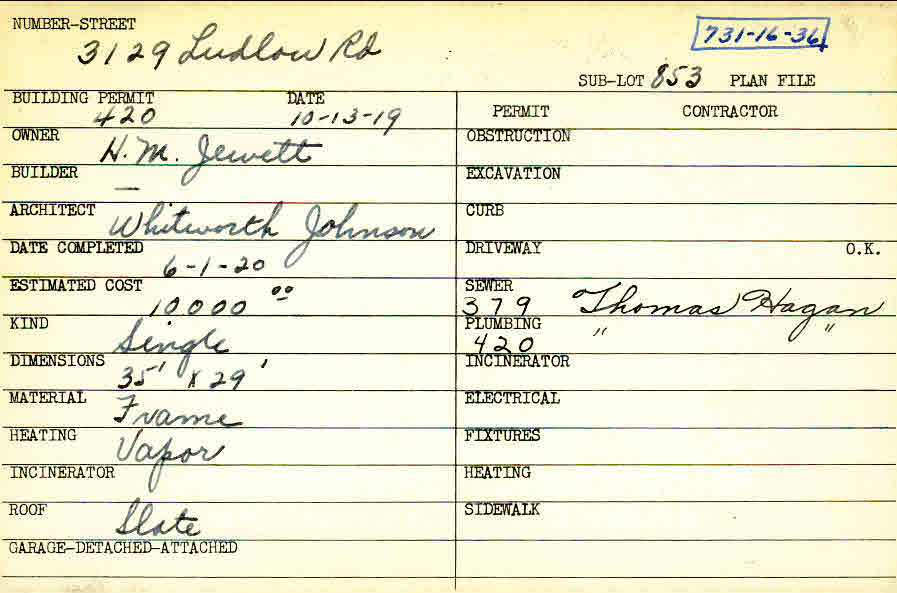 3129 Ludlow Road Shaker Heights, OH 44120 PARCEL ID: 731-16-036 Building Permit Date: 10-13-1919 Plan File Number: 0 Neighborhood: Ludlow Owner: Jewett, H. M. Architect: Whitworth Johnson Estimated Cost: 10000 Date Completed: 06-01-1920 Kind: Single, Single Residence or Dwelling Material: Frame Heating: Vapor Roof: Slate |