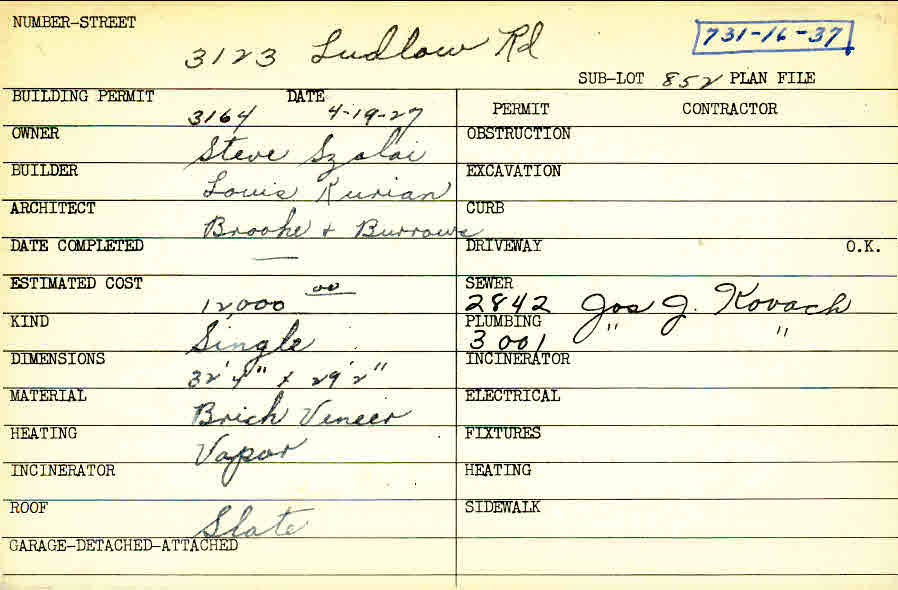 3123 Ludlow Road Shaker Heights, OH 44120 PARCEL ID: 731-16-037 Building Permit Date: 04-19-1927 Plan File Number: 0 Neighborhood: Ludlow Owner: Szalai, Steve Builder: Rurian, Louis Architect: Brooke and Burrows Estimated Cost: 12000 Kind: Single, Single Residence or Dwelling Material: Brick Veneer Heating: Vapor Roof: Slate |