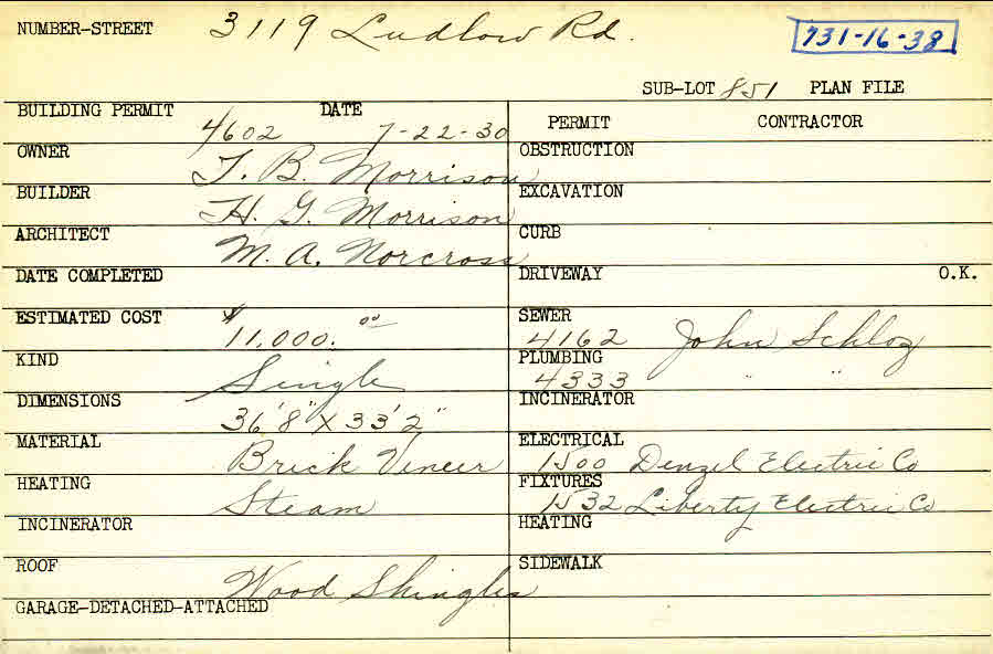 3119 Ludlow Road Shaker Heights, OH 44120 PARCEL ID: 731-16-038 Building Permit Date: 07-22-1930 Plan File Number: 0 Neighborhood: Ludlow Owner: Morrison, T. B. Builder: Morrison, H. G. Architect: Norcross, M. A. Estimated Cost: 11000 Kind: Single, Single Residence or Dwelling Material: Brick Veneer Heating: Steam Roof: Wood Shingle Card Available: yes |