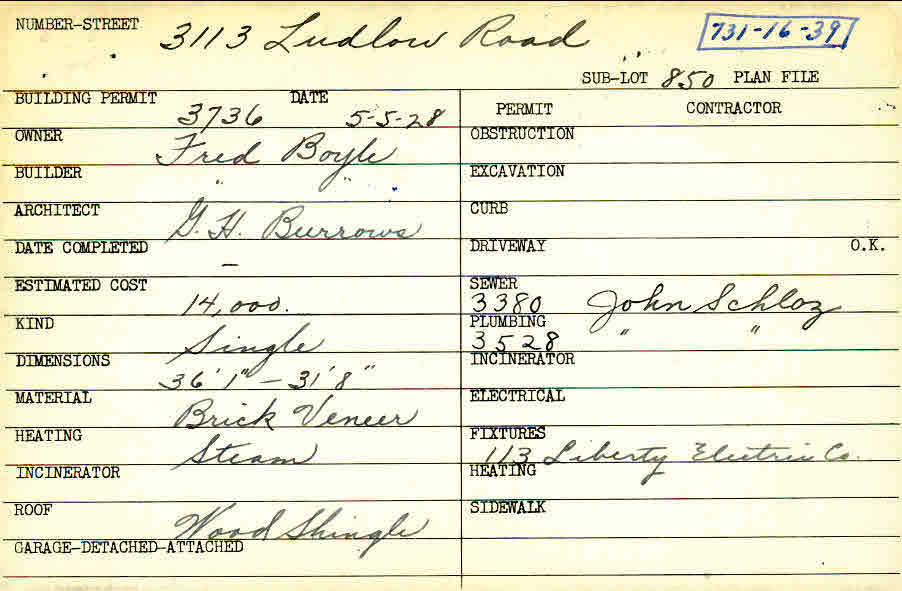 3113 Ludlow Road Shaker Heights, OH 44120 PARCEL ID: 731-16-039 Building Permit Date: 05-05-1928 Plan File Number: 0 Neighborhood: Ludlow Owner: Boyle, Fred Builder: Boyle, Fred Architect: Burrows, G. H. Estimated Cost: 14000 Kind: Single, Single Residence or Dwelling Material: Brick Veneer Heating: Steam Roof: Wood Shingle Card Available: yes |