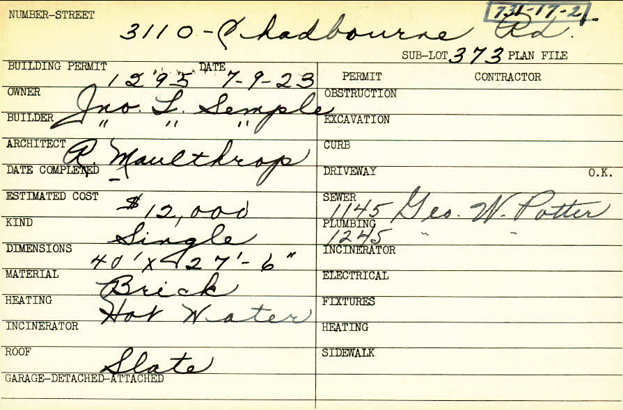 3110 Chadbourne Road Shaker Heights, OH 44120 PARCEL ID: 731-17-002 Building Permit Date: 07-09-1923 Plan File Number: 6774, 12470 Microfilm Roll: Roll#88, NewRoll#13 Neighborhood: Onaway Owner: Semple, John L. Builder: Semple, John L. Architect: Moulthrop, Ray Estimated Cost: 12000 Kind: Single, Single Residence or Dwelling Material: Brick Heating: Hot Water Roof: Slate |