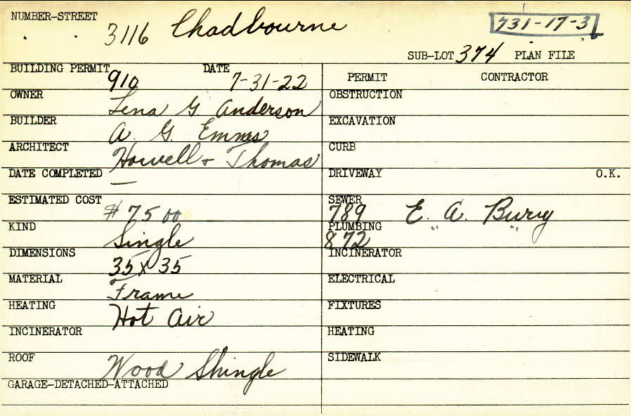 3116 Chadbourne Road Shaker Heights, OH 44120 PARCEL ID: 731-17-003 Building Permit Date: 07-31-1922 Plan File Number: 0 Neighborhood: Onaway Owner: Anderson, Lena G. Builder: Emmes, A. G. Architect: Howell and Thomas Estimated Cost: 7500 Kind: Single, Single Residence or Dwelling Material: Frame Heating: Hot Air Roof: Wood Shingle |