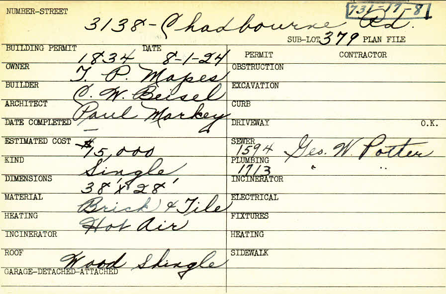 3138 Chadbourne Road Shaker Heights, OH 44120 PARCEL ID: 731-17-008 Building Permit Date: 08-01-1924 Plan File Number: 0 Neighborhood: Onaway Owner: Mapes, T. P. Builder: Beisel, C. W. Architect: Markey, Paul Estimated Cost: 15000 Kind: Single, Single Residence or Dwelling Material: Brick and Tile Heating: Hot Air Roof: Wood Shingle |