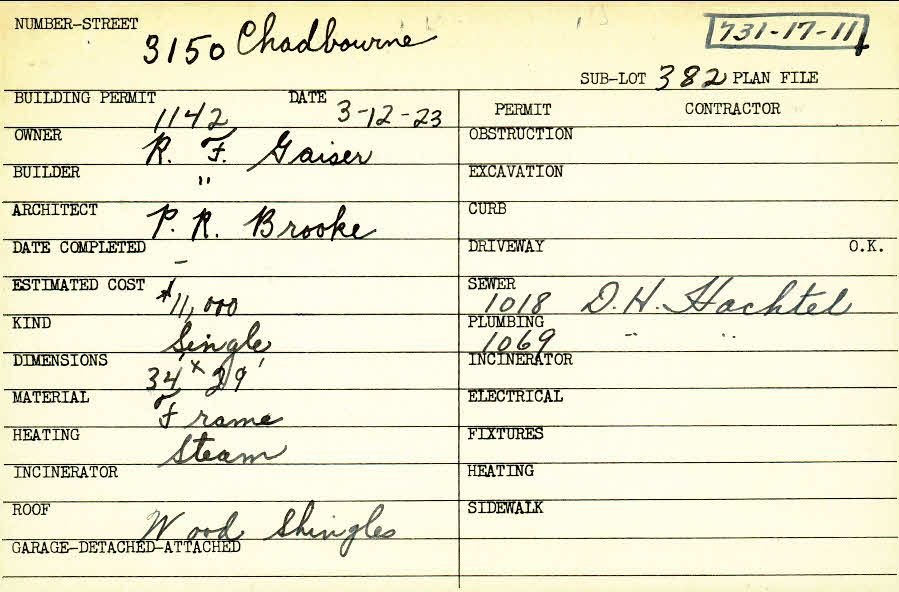 3150 Chadbourne Road Shaker Heights, OH 44120 PARCEL ID: 731-17-011 Building Permit Date: 03-12-1923 Plan File Number: 12235 Microfilm Roll: NewRoll#11 Owner: Gaiser, R. F. Builder: Gaiser, R. F. Architect: Brooke, Philo R. Estimated Cost: 11000 Kind: Single, Single Residence or Dwelling Material: Frame Heating: Steam Roof: Wood Shingle |