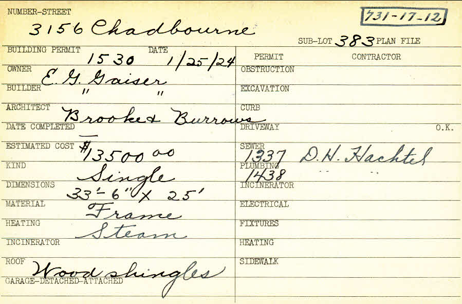 3156 Chadbourne Road Shaker Heights, OH 44120 PARCEL ID: 731-17-012 Building Permit Date: 01-25-1924 Plan File Number: 1979, 4224, 5771 Microfilm Roll: Roll#29, Roll#61, Roll#78 Neighborhood: Onaway Owner: Gaiser, E. G. Builder: Gaiser, E. G. Architect: Brooke and Burrows Estimated Cost: 13500 Kind: Single, Single Residence or Dwelling Material: Frame Heating: Steam Roof: Wood Shingle |