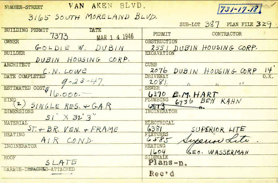 3165 Van Aken Boulevard Shaker Heights, OH 44120 PARCEL ID: 731-17-018 Building Permit Date: 03-14-1946 Plan File Number: 329 all scanned Microfilm Roll: Roll004 Neighborhood: Onaway Owner: Dubin, Goldie W. Builder: Dubin Housing Corporation Architect: Lowe, C. N. Estimated Cost: 16000 Date Completed: 09-23-1947 Kind: Single Dwelling and Garage (2) Material: Stone and Brick Veneer and Frame Heating: Air Conditioned Roof: Slate Garage: attached |