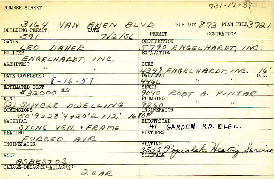 3164 Van Aken Boulevard Shaker Heights, OH 44120 PARCEL ID: 731-17-031 Building Permit Date: 07-02-1956 Plan File Number: 3721 Microfilm Roll: Roll#51 Neighborhood: Ludlow Owner: Daher, Leo Builder: Engelhardt Inc. Architect: Engelhardt Inc. Estimated Cost: 32000 Date Completed: 08-16-1957 Kind: Single, Single Residence or Dwelling (2) Material: Stone Veneer and Frame Heating: Forced Air Roof: Asbestos Garage: attached 2 car |