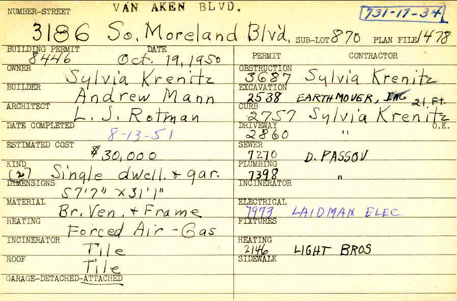 3186 Van Aken Boulevard Shaker Heights, OH 44120 PARCEL ID: 731-17-034 Building Permit Date: 10-19-1950 Plan File Number: 1478 all scanned Microfilm Roll: Roll017 Neighborhood: Ludlow Owner: Krenitz, Sylvia Builder: Mann, Andrew Architect: Rotman. L. J. Estimated Cost: 30000 Date Completed: 08-13-1951 Kind: Single Dwelling and Garage (2) Material: Brick Veneer and Frame Heating: Forced Air - Gas Roof: Tile Garage: attached |