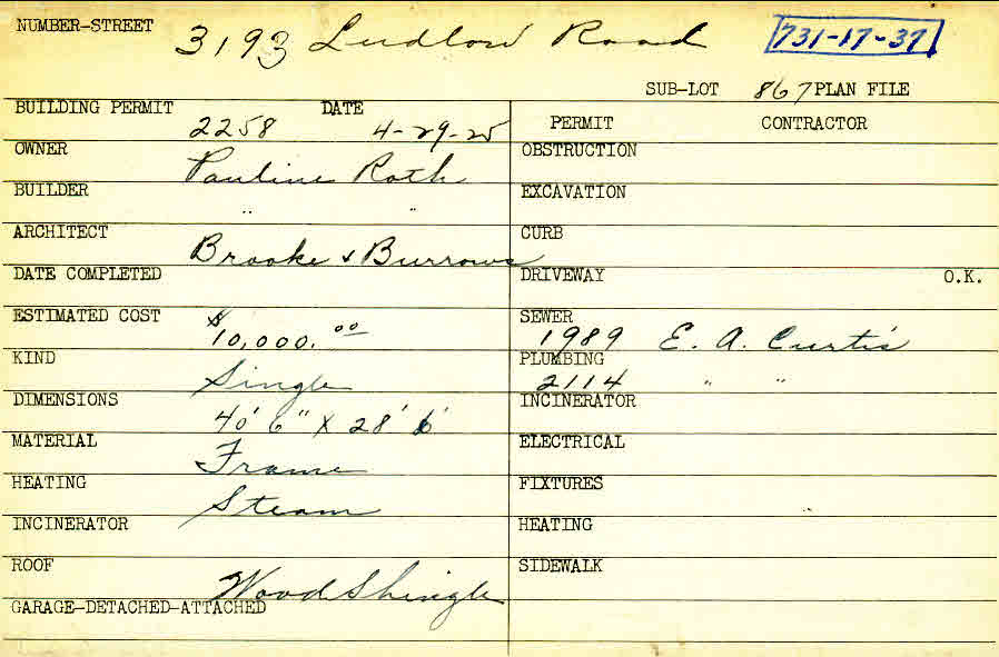 3193 Ludlow Road Shaker Heights, OH 44120 PARCEL ID: 731-17-037 Building Permit Date: 04-29-1925 Plan File Number: 7710 Microfilm Roll: Roll#94 Neighborhood: Ludlow Owner: Roth, Pauline Builder: Roth, Pauline Architect: Brooke and Burrows Estimated Cost: 10000 Kind: Single, Single Residence or Dwelling Material: Frame Heating: Steam Roof: Wood Shingle |