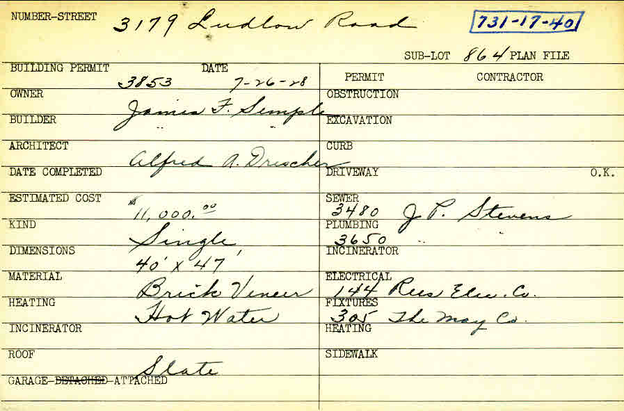 3179 Ludlow Road Shaker Heights, OH 44120 PARCEL ID: 731-17-040 Building Permit Date: 07-26-1928 Plan File Number: 0 Neighborhood: Ludlow Owner: Simple, James F. Builder: Simple, James F. Architect: Drescher, Alfred A. Estimated Cost: 11000 Kind: Single, Single Residence or Dwelling Material: Brick Veneer Heating: Hot Water Roof: Slate Garage: attached Card Available: yes |