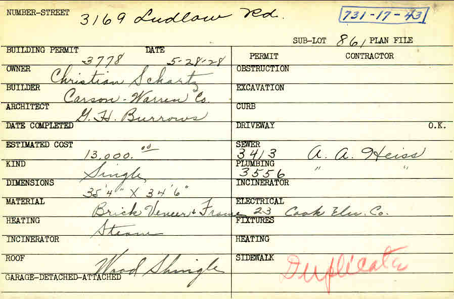 3169 Ludlow Road Shaker Heights, OH 44120 PARCEL ID: 731-17-043 Building Permit Date: 05-28-1928 Plan File Number: 1078 all scanned Microfilm Roll: Roll013 Neighborhood: Ludlow Owner: Schartz, Christian Builder: Carson-Warren Company Architect: Burrows, G. H. Estimated Cost: 13000 Kind: Single, Single Residence or Dwelling Material: Brick Veneer and Frame Heating: Steam Roof: Wood Shingle |