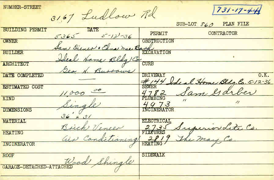 3167 Ludlow Road Shaker Heights, OH 44120 PARCEL ID: 731-17-044 Building Permit Date: 05-12-1936 Plan File Number: 1308 scanned, 12176 Microfilm Roll: Roll015, NewRoll#11 Neighborhood: Ludlow Owner: Diener, Sam and Bard, Elna Mae Builder: Ideal Home Building Company Architect: Burrows, George H. Estimated Cost: 11000 Kind: Single, Single Residence or Dwelling Material: Brick Veneer Heating: Air Conditioned Roof: Wood Shingle |