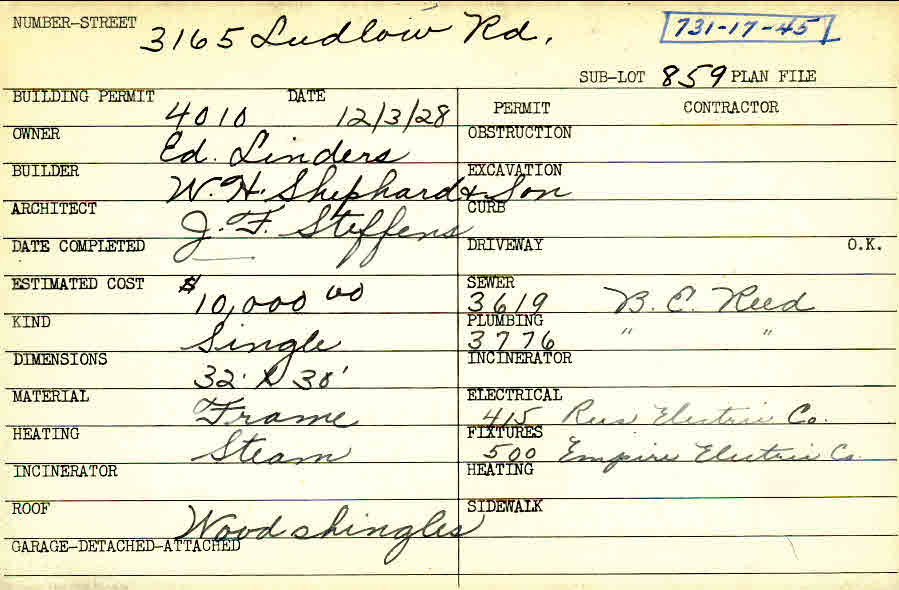 3165 Ludlow Road Shaker Heights, OH 44120 PARCEL ID: 731-17-045 Building Permit Date: 12-03-1928 Plan File Number: 0 Neighborhood: Ludlow Owner: Linders, Ed. Builder: W. H. Shephard and Son Architect: Steffens, J. F. Estimated Cost: 10000 Kind: Single, Single Residence or Dwelling Material: Frame Heating: Steam Roof: Wood Shingle Card Available: yes |