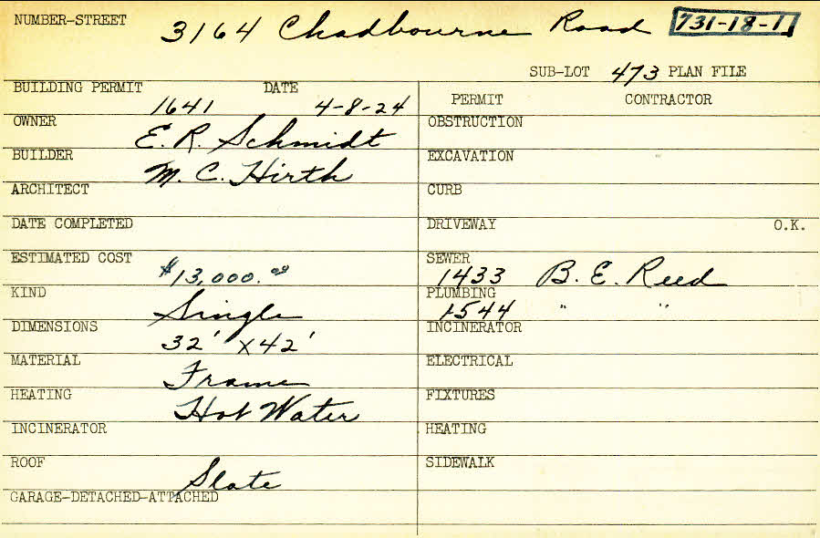 3164 Chadbourne Road Shaker Heights, OH 44120 PARCEL ID: 731-18-001 Building Permit Date: 04-08-1924 Plan File Number: 0 Neighborhood: Onaway Owner: Schmidt, E. R. Builder: Hirth, M. C. Estimated Cost: 13000 Kind: Single, Single Residence or Dwelling Material: Frame Heating: Hot Water Roof: Slate |
