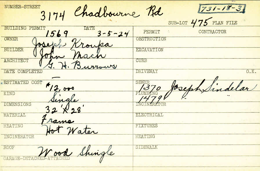 3174 Chadbourne Road Shaker Heights, OH 44120 PARCEL ID: 731-18-003 Building Permit Date: 03-05-1924 Plan File Number: 10712 Microfilm Roll: NewRoll#5 Neighborhood: Onaway Owner: Kroupa, Joseph Builder: Mach, John Architect: Burrows, George H. Estimated Cost: 12000 Kind: Single, Single Residence or Dwelling Material: Frame Heating: Hot Water Roof: Wood Shingle |