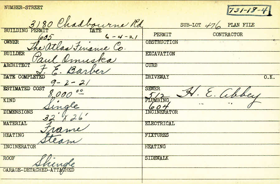 3180 Chadbourne Road Shaker Heights, OH 44120 PARCEL ID: 731-18-004 Building Permit Date: 06-04-1921 Plan File Number: 6820, 7497 Microfilm Roll: Roll#88, Roll#93 Neighborhood: Onaway Owner: The Atlas Finance Company Builder: Omuska, Paul Architect: Barber, F. E. Estimated Cost: 8000 Date Completed: 09-02-1921 Kind: Single, Single Residence or Dwelling Material: Frame Heating: Steam Roof: Shingles |