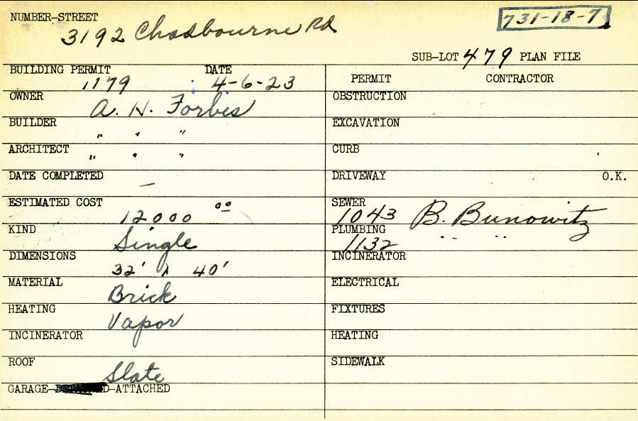 3192 Chadbourne Road Shaker Heights, OH 44120 PARCEL ID: 731-18-007 Building Permit Date: 04-06-1923 Plan File Number: 12796 Microfilm Roll: NewRoll#15 Neighborhood: Onaway Owner: Forbes, A. H. Builder: Forbes, A. H. Architect: Forbes, A. H. Estimated Cost: 12000 Kind: Single, Single Residence or Dwelling Material: Brick Heating: Vapor Roof: Slate Garage: attached |