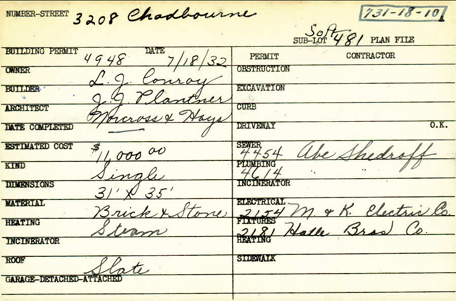 3208 Chadbourne Road Shaker Heights, OH 44120 PARCEL ID: 731-18-010 Building Permit Date: 07-18-1932 Plan File Number: 0 Neighborhood: Onaway Owner: Conroy, L. J. Builder: Plantner, J. J. Architect: Norcross and Hays Estimated Cost: 11000 Kind: Single, Single Residence or Dwelling Material: Brick and Stone Heating: Steam Roof: Slate |