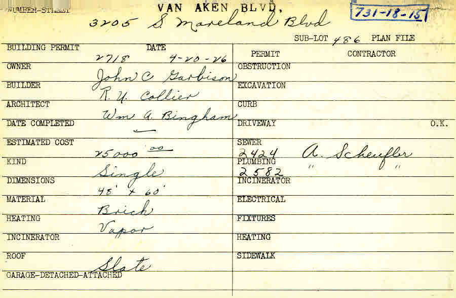 3205 Van Aken Boulevard Shaker Heights, OH 44120 PARCEL ID: 731-18-015 Building Permit Date: 04-20-1926 Plan File Number: 0 Neighborhood: Onaway Owner: Garbison, John C. Builder: Collier, R. U. Architect: Bingham, William A. Estimated Cost: 25000 Kind: Single, Single Residence or Dwelling Material: Brick Heating: Vapor Roof: Slate Card Available: yes |