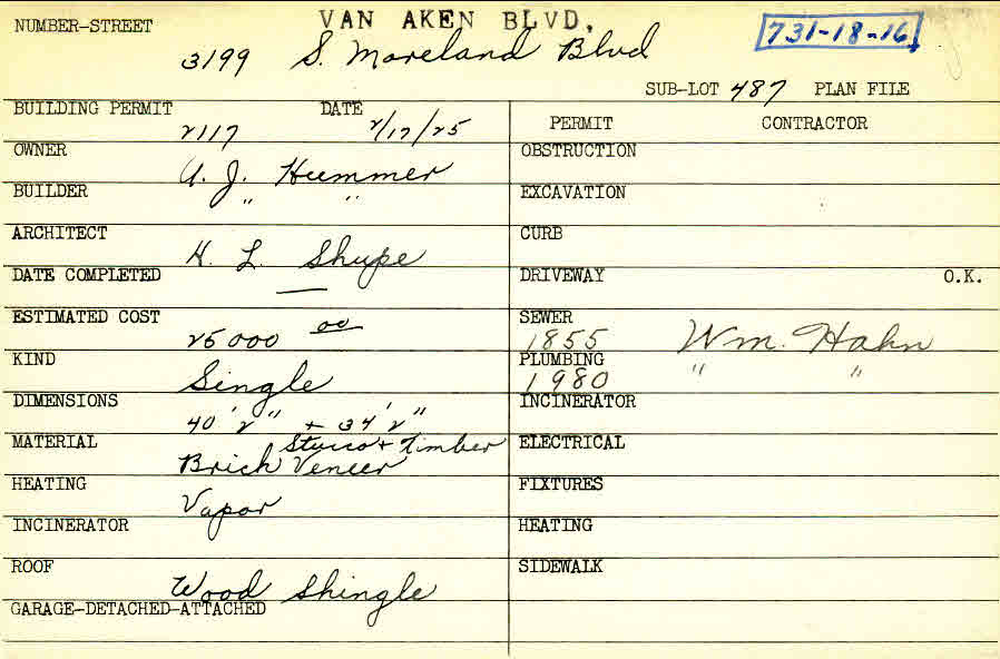 3199 Van Aken Boulevard Shaker Heights, OH 44120 PARCEL ID: 731-18-016 Building Permit Date: 02-17-1925 Plan File Number: 3314 Microfilm Roll: Roll#48 Neighborhood: Onaway Owner: Hummer, A. J. Builder: Hummer, A. J. Architect: Shupe, H. L. Estimated Cost: 25000 Kind: Single, Single Residence or Dwelling Material: Brick Veneer, Stucco and Timber Heating: Vapor Roof: Wood Shingle |