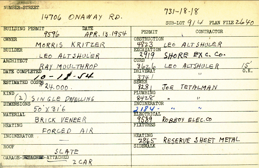 14706 Onaway Road Shaker Heights, OH 44120 PARCEL ID: 731-18-018 Building Permit Date: 04-13-1954 Plan File Number: 2640 Neighborhood: Ludlow Owner: Kritzer, Morris Builder: Altshuler, Leo Architect: Moulthrop, Ray Estimated Cost: 24000 Date Completed: 10-18-1954 Kind: Single, Single Residence or Dwelling (2) Material: Brick Veneer Heating: Forced Air Roof: Slate Garage: attached 2 car Card Available: yes |