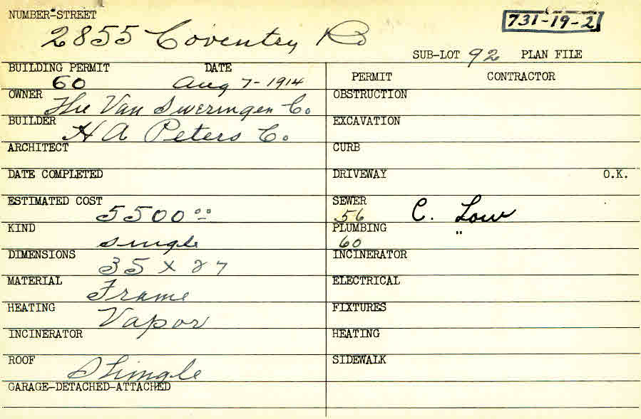 2855 Coventry Road Shaker Heights, OH 44120 PARCEL ID: 731-19-002 Building Permit Date: 08-07-1914 Plan File Number: 2823 scanned Microfilm Roll: Roll041 Owner: The Van Sweringen Company Builder: H. A. Peters Company Estimated Cost: 5500 Kind: Single, Single Residence or Dwelling Material: Frame Heating: Vapor Roof: Shingles |