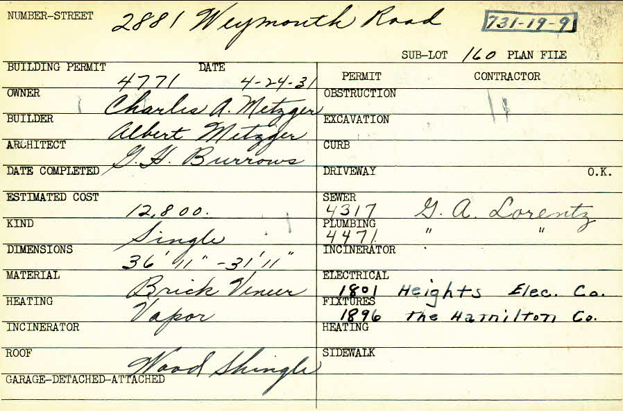 2881 Weymouth Road Shaker Heights, OH 44120 PARCEL ID: 731-19-009 Building Permit Date: 04-24-1931 Plan File Number: 0 Neighborhood: Boulevard Owner: Metzger, Charles A. Builder: Metzger, Albert Architect: Burrows, G. H. Estimated Cost: 12800 Kind: Single, Single Residence or Dwelling Material: Brick Veneer Heating: Vapor Roof: Wood Shingle |