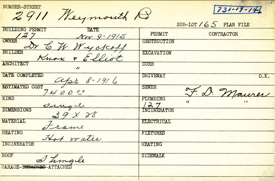 2911 Weymouth Road Shaker Heights, OH 44120 PARCEL ID: 731-19-014 Building Permit Date: 11-09-1915 Plan File Number: 0 Neighborhood: Boulevard Owner: Wyckoff, Dr. C. W. Builder: Knox and Elliot Architect: Knox and Elliot Estimated Cost: 7400 Date Completed: 04-08-1916 Kind: Single, Single Residence or Dwelling Material: Frame Heating: Hot Water Roof: Shingles Garage: attached |