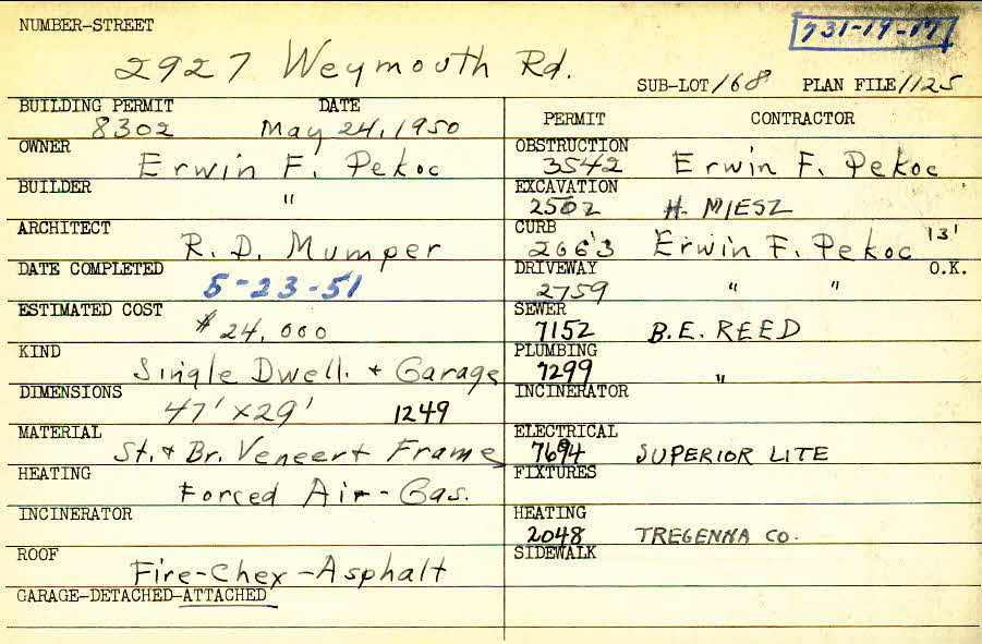 2927 Weymouth Road Shaker Heights, OH 44120 PARCEL ID: 731-19-017 Building Permit Date: 05-24-1950 Plan File Number: 1125 all scanned Microfilm Roll: Roll013 Neighborhood: Boulevard Owner: Pekoc, Erwin F. Builder: Pekoc, Erwin F. Architect: Mumper, R. D. Estimated Cost: 24000 Date Completed: 05-23-1951 Kind: Single Dwelling and Garage Material: Stone and Brick Veneer and Frame Heating: Forced Air - Gas Roof: Asphalt Garage: attached |