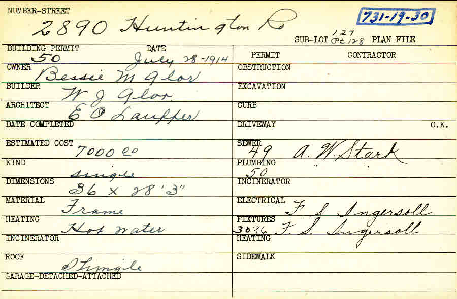 2890 Huntington Road Shaker Heights, OH 44120 PARCEL ID: 731-19-030 Building Permit Date: 07-28-1914 Plan File Number: 10154 Microfilm Roll: New Roll#2 Neighborhood: Boulevard Owner: Glor, Bessie M. Builder: Glor, W. J. Architect: Lauffer, E. O. Estimated Cost: 7000 Kind: Single, Single Residence or Dwelling Material: Frame Heating: Hot Water Roof: Shingles |