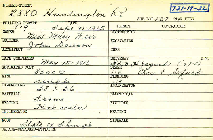 2880 Huntington Road Shaker Heights, OH 44120 PARCEL ID: 731-19-032 Building Permit Date: 09-21-1915 Plan File Number: 4399 Microfilm Roll: Roll#63 Neighborhood: Boulevard Owner: Weir, Miss Mary Builder: Dawson, John Estimated Cost: 8000 Date Completed: 05-15-1916 Kind: Single, Single Residence or Dwelling Material: Frame Heating: Hot Water Roof: Slate |