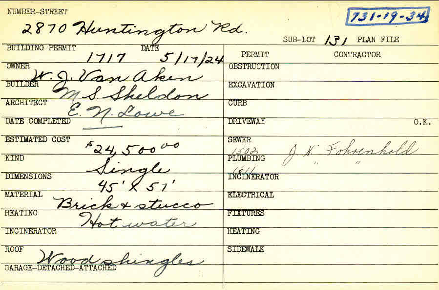 2870 Huntington Road Shaker Heights, OH 44120 PARCEL ID: 731-19-034 Building Permit Date: 05-17-1924 Plan File Number: 0 Neighborhood: Boulevard Owner: Van Aken, W. J. Builder: Sheldon, M. S. Architect: Lowe, E. N. Estimated Cost: 24500 Kind: Single, Single Residence or Dwelling Material: Brick and Stucco Heating: Hot Water Roof: Wood Shingle Card Available: yes |