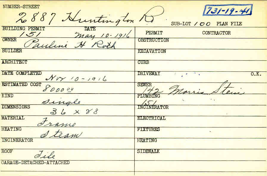 2887 Huntington Road Shaker Heights, OH 44120 PARCEL ID: 731-19-041 Building Permit Date: 05-10-1916 Plan File Number: 4575, 12401 Microfilm Roll: Roll#64, NewRoll#13 Neighborhood: Boulevard Owner: Roth, Pauline H. Estimated Cost: 8000 Date Completed: 11-10-1916 Kind: Single, Single Residence or Dwelling Material: Frame Heating: Steam Roof: Tile |