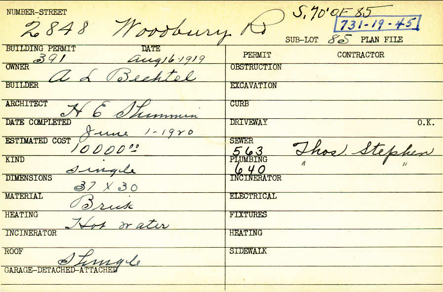 2848 Woodbury Road Shaker Heights, OH 44120 PARCEL ID: 731-19-045 Building Permit Date: 08-16-1919 Plan File Number: 12344, 12394 Microfilm Roll: NewRoll#12 Neighborhood: Boulevard Owner: Bechtel, A. L. Architect: Shimmin, H. E. Estimated Cost: 10000 Date Completed: 06-01-1920 Kind: Single, Single Residence or Dwelling Material: Brick Heating: Hot Water Roof: Shingles |