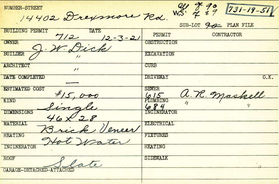 14402 Drexmore Road Shaker Heights, OH 44120 PARCEL ID: 731-19-051 Building Permit Date: 12-03-1921 Plan File Number: 0 Neighborhood: Boulevard Owner: Dick, J. W. Builder: Dick, J. W. Architect: Dick, J. W. Estimated Cost: 15000 Kind: Single, Single Residence or Dwelling Material: Brick Veneer Heating: Hot Water Roof: Slate Card Available: yes |