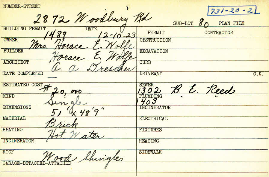 2872 Woodbury Road Shaker Heights, OH 44120 PARCEL ID: 731-20-002 Building Permit Date: 12-10-1923 Plan File Number: 8058 Microfilm Roll: Roll#97, Roll#99 Neighborhood: Boulevard Owner: Wolfe, Mrs. Horace E. Builder: Wolfe, Horace E. Architect: Drescher, A. A. Estimated Cost: 20000 Kind: Single, Single Residence or Dwelling Material: Brick Heating: Hot Water Roof: Wood Shingle |