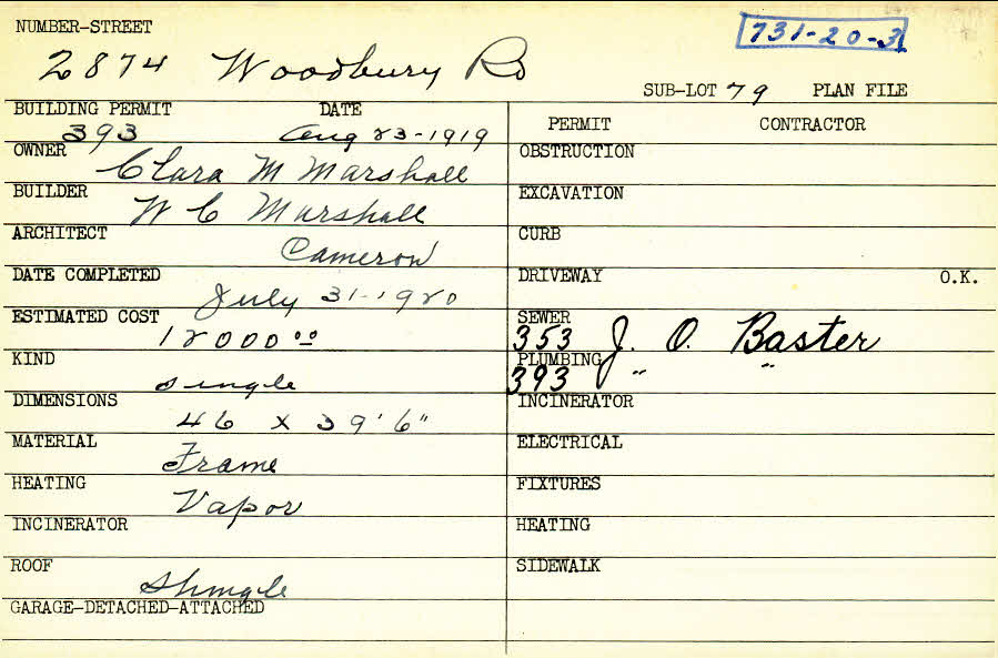 2874 Woodbury Road Shaker Heights, OH 44120 PARCEL ID: 731-20-003 Building Permit Date: 08-23-1919 Plan File Number: 0 Neighborhood: Boulevard Owner: Marshall, Clara M. Builder: Marshall, W. C. Architect: Cameron Estimated Cost: 12000 Date Completed: 07-31-1920 Kind: Single, Single Residence or Dwelling Material: Frame Heating: Vapor Roof: Shingles |