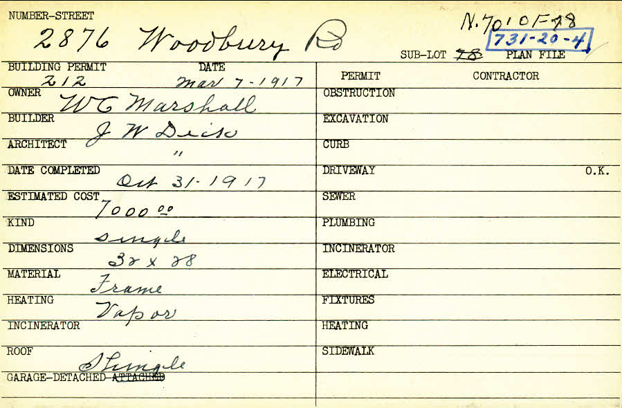 2876 Woodbury Road Shaker Heights, OH 44120 PARCEL ID: 731-20-004 Building Permit Date: 03-07-1917 Plan File Number: 0 Neighborhood: Boulevard Owner: Marshall, W. C. Builder: Dick, J. W. Architect: Dick, J. W. Estimated Cost: 7000 Date Completed: 10-31-1917 Kind: Single, Single Residence or Dwelling Material: Frame Heating: Vapor Roof: Shingles Garage: detached |