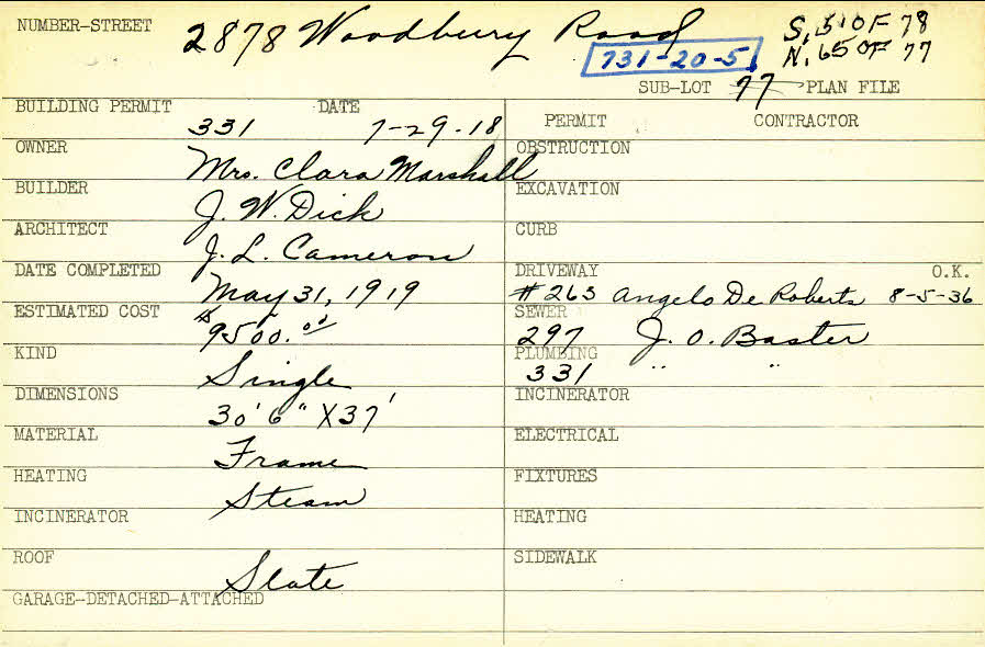 2878 Woodbury Road Shaker Heights, OH 44120 PARCEL ID: 731-20-005 Building Permit Date: 07-29-1918 Plan File Number: 0 Neighborhood: Boulevard Owner: Marshall, Mrs. Clara Builder: Dick, J. W. Architect: Cameron, J. L. Estimated Cost: 9500 Date Completed: 05-31-1919 Kind: Single, Single Residence or Dwelling Material: Frame Heating: Steam Roof: Slate |
