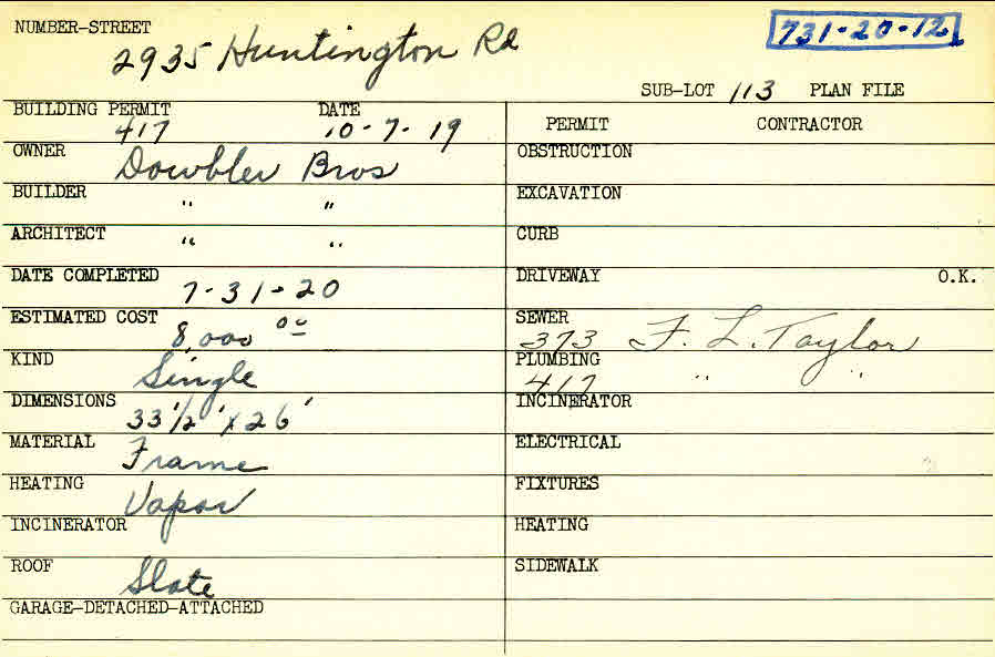2935 Huntington Road Shaker Heights, OH 44120 PARCEL ID: 731-20-012 Building Permit Date: 10-07-1919 Plan File Number: 12099 Microfilm Roll: NewRoll#11 Neighborhood: Boulevard Owner: Dowbler Brothers Builder: Dowbler Brothers Architect: Dowbler Brothers Estimated Cost: 8000 Date Completed: 07-31-1920 Kind: Single, Single Residence or Dwelling Material: Frame Heating: Vapor Roof: Slate |